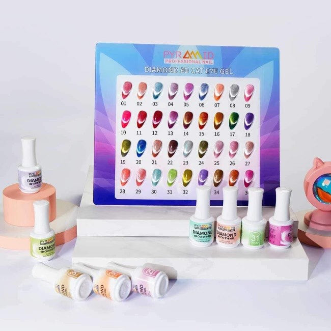 Experience a rainbow of sparkle with our Pyramid 9D Cat Eye Collection in 36 stunning shades! Our sparkly gel polish will make your nails stand out and shine. Elevate your nail game and let your creativity run wild with our versatile and long-lasting colors.